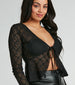 Create a dreamy bohemian look for festival season with this long sleeve tie-front lace top! The airy sheer lace fabric will give your 'fit that effortlessly chic vibe. The top features a V-neckline. long fitted sleeves for coverage. and a trendy tie-front design leading to a center-front slit with a subtle flowy fit. Style with flare pants and strappy sandals.