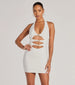 A sleeveless crepe mini dress flaunts a halter neckline. triple buckle straps. and a cutout design along a bodycon silhouette. Perfect for going out at night.