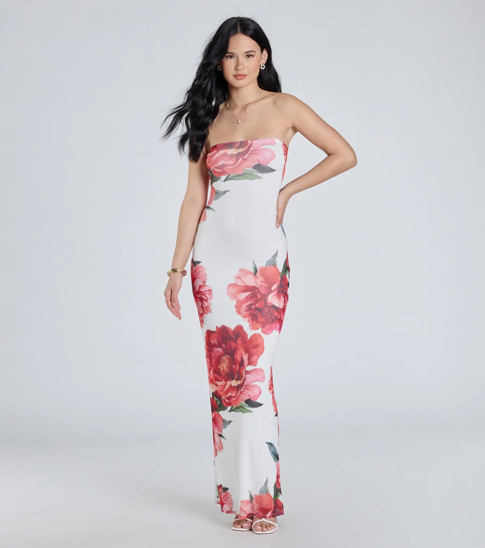 Bold Stunner Floral Mesh Strapless Maxi Dress