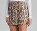 Showcase your bold style in this snake pattern skirt featuring a high-rise waist. side slit accent. and mini-length hem. Composed of a brushed knit fabric with a moderate stretch. Perfect for styling with thigh-high boots.