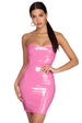 Bombshell alert! Make a bold statement in this sultry mini dress! It features a bubble gum pink hue. a strapless sweetheart neckline and princess seams that accentuates curves in all the right places. Dress is composed of a lined faux patent leather fabric that offers a slight stretch.