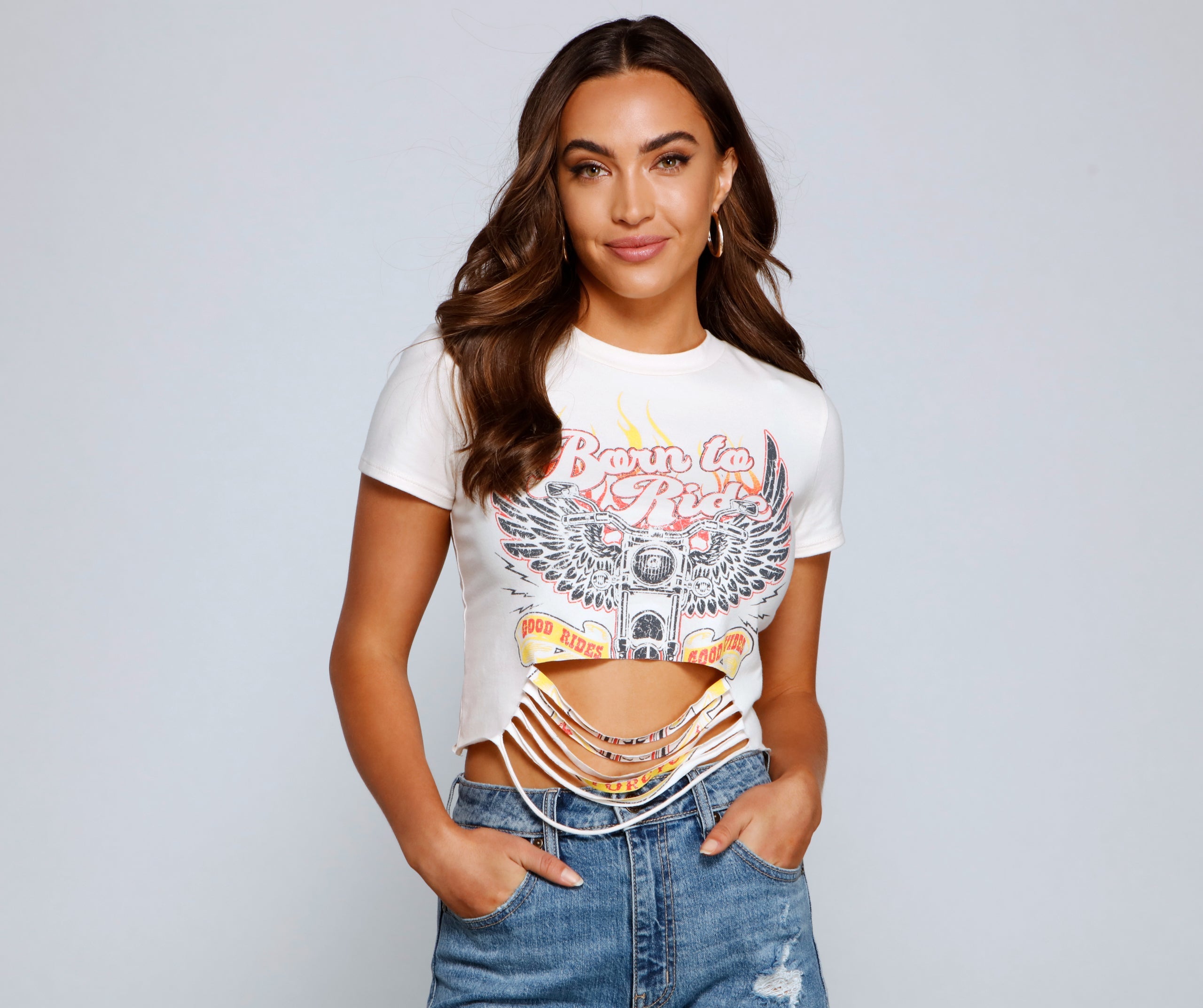 Show off your adventurous side with a graphic tee that says it all! The tee features a crew neckline. short sleeves. a graphic that reads: "Born to Ride". an image of eagle wings with a motorcycle. slashed detailing. and a cropped hem. Complete look with high waist shorts and combat boots.Â