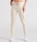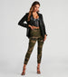 Command the scene like the boss you are in these on-trend camouflage joggers. They feature a mid-rise waist with a ribbed knit elasticized waistband. a tie-front design. cargo-style pockets. and a tapered. ribbed knit. jogger hem. The woven fabric offers minimal stretch. Style with a faux leather corset and strappy heels.