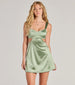 Leave the room breathless when you show up to stun in this satin mini dress at the school dance or party! This stunning dress features a flattering V-neckline. padded bra cups. and adjustable shoulder straps for a perfect fit. The alluring lace-up back and cutout sides add a touch of flirty. while the A-line silhouette and mini-length hem in the luxurious satin fabric will have you feeling like a true queen. Compliment your look with a glam hair accessory and high heels!