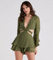 Breeze into the party in this skater romper for a flirty allure everywhere you go! It features peasant long sleeves. a plunge V-neckline. a cutout waist with a tie-back design. and a layered ruffle skort bottom. Complete the look in strappy sandals.