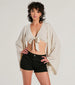 This linen crop top boasts breezy energy for effortless summer styling! Featuring stylish bell sleeves and a trendy tie-front design. this top will elevate your fashion game. The cropped hem adds a modern touch. Complete the look in a denim mini skirt and sandals.