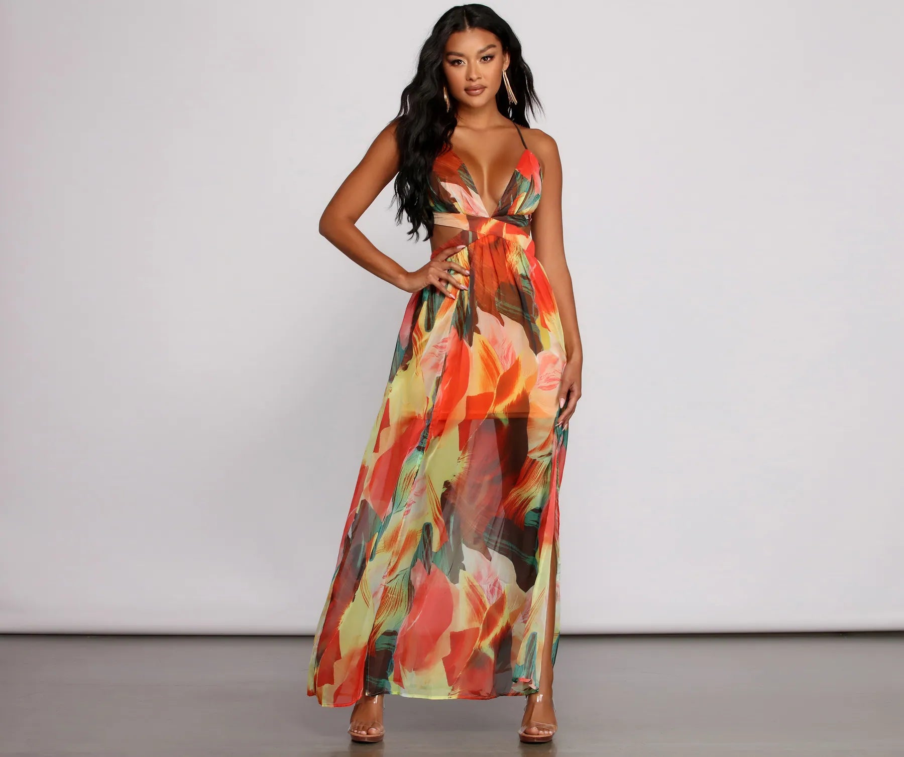 Bring on brighter vibes in this maxi dress that brings a burst of color this season. The maxi dress features a plunging v-neckline. sexy waist cutout to show off a hint of skin. a lace-up back. and a high side slit. Complete your look with fab cork wedges and sunnies for those ultimate summer vibes.
