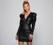 Bring the drama in a bodycon that creates a head-turning moment! The dress features a plunging V-neckline. long puff sleeves. a cinching belted waist. and a mini-length silhouette. The dress is composed of a curve-hugging faux leather fabric that offers a moderate stretch. Complete look with clear mules.