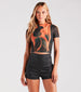 Bring the heat to your bold party look with this flame print crop top! It features a crew neckline. short sleeves. a fitted cropped hem. and a flame print pattern on the stretchy sheer mesh fabric. Style with a mini skirt and thigh-high boots.