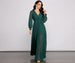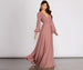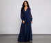 Get a stunningly beautiful look in our chic Bryn chiffon formal dress. She features a wrap front V neck and back with a back button closure. long sheer blouson sleeves with button detailing. a high elastic banded waist with a tie detail. and a flowy. floor-length A-line silhouette. The dress is composed of a sheer chiffon fabric with no stretch and with a short knit lining. Complete your outfit with a sleek ring set and strappy heels.