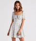 Create a dreamy spring date outfit in this adorable floral chiffon skater dress! It features a square neckline. ruching at the bust. a tie-front accent and keyhole cutout. short puff sleeves. a high waist seam. and a short skater skirt with a fit and flare silhouette. The airy chiffon fabric features an all-over dainty floral print pattern for the prettiest look. Style with espadrille sandals.