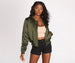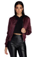 Bundle up with style with this sleek and trendy bomber jacket! It features a zip front. long sleeves with a single zipper pocket detail. front pockets with snap button closures. and a ribbed knit trim. The jacket is composed of a smooth polyester fabric. includes a lining. and offers a relaxed and comfortable fit.