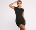 Keep it casual in a knit mini dress. The dress features a round neckline. short sleeves. ruched side seams with bungee straps and a mini length silhouette. The dress is composed of a smooth knit fabric that offers a form hugging fit with a moderate stretch. Complete look with hoops and heels to dress up this casual dress.Â