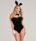 Keep it iconic this Halloween with this chic corset bodysuit for a glam-inspired bunny costume! Designed with smooth velvet. it features a sweetheart neckline accented with a marabou feather trim. a corset bodice with a structured and padded bust. adjustable spaghetti straps that you can remove to make it strapless. a sultry lace-up back. and a cheeky form-hugging fit. Complete your alluring costume with the matching bunny ears and tail set. bowtie and cuff set. and rhinestone platform heels.