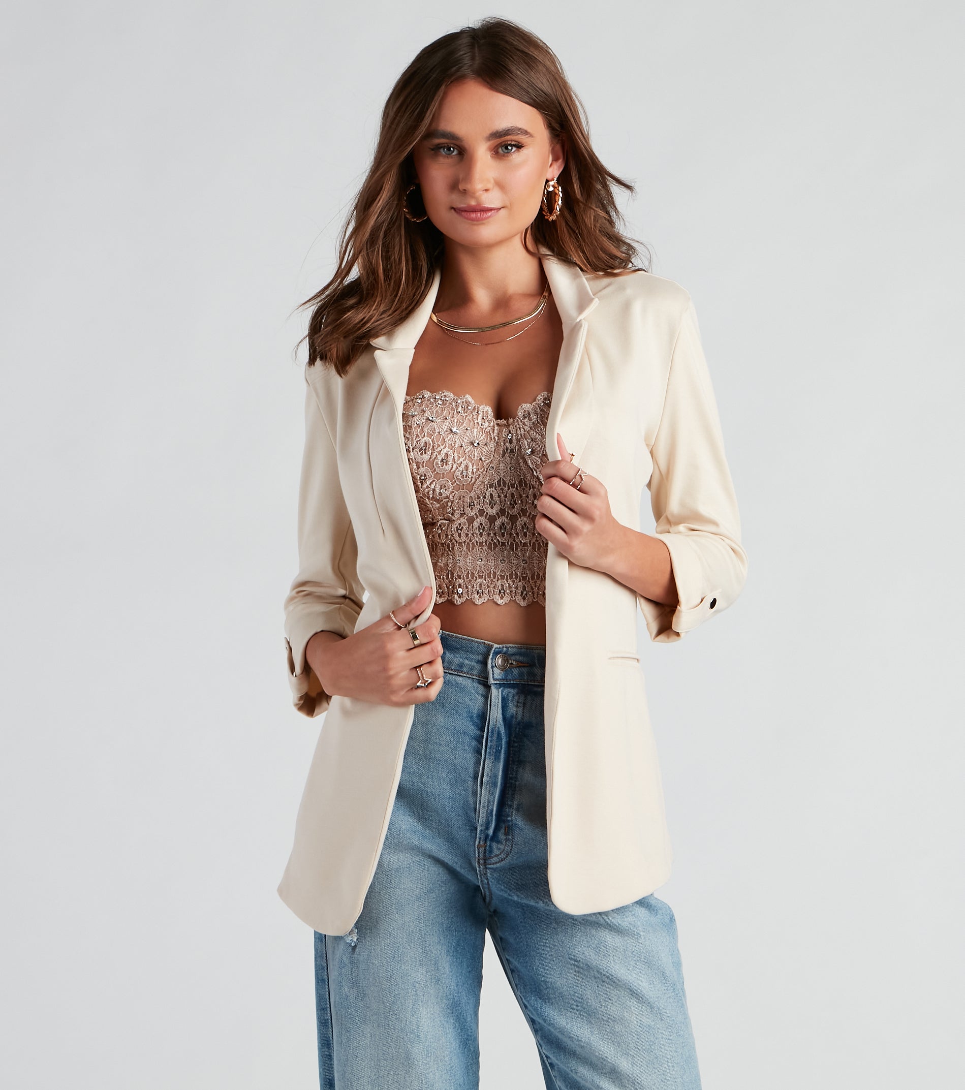 Create your best workwear fit yet layering on this chic Ponte blazer featuring three-quarter-length roll cuff sleeves. shoulder pads. a lapel collar neckline. an open-front design. faux front pockets. and a hip-length hem. Complete the look in a sleek layered necklace and heels.