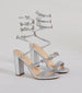 Add a whimsical mystique to your outfit with these statement metallic block heels perfect for dressy events! They feature an almond-shaped toe. a wide toe strap with mini rhinestone trim. and a spiral ankle rhinestone strap with butterfly accents. Complete the look with a ring set.