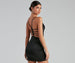This silk mini dress is a thing of beauty! It features a sleeveless. adjustable spaghetti strap design on a cowl neck. a fitted bodice. and a caged strap back with zipper closure. The soft silk fabric offers a minimal stretch. Complete your night-out look in glitter heels and earrings.