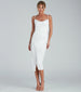 The Callie satin midi dress will keep your formal looks sleek and oh-so-chic! She features a sleeveless cowl neckline. adjustable spaghetti straps for a customized fit. front ruching at the waist. and a mid-length. wrap-front fitted silhouette creating a front slit. Style this dress with pretty hoops and clear heels.