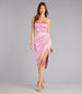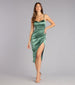 Built to flatter every curve. the Camila formal dress moves like liquid light. Crafted from glossy satin with a sweetheart neckline and side-pleated seam. this form-hugging midi steals the spotlight with its draped wrap slit—made for those moments when all eyes are on you.