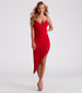 Captivate the crowd in this crepe midi dress showcasing luxe details sure to impress! It features a sleeveless v-neckline. spaghetti straps. a bodycon silhouette. side ruched seam leading to the asymmetrical. side cutout hem with rhinestone trim. Style with hoop earrings and heels to complete the look!Â