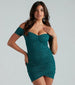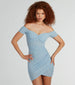 This glitter mini dress calls for a night of captivating everyone! It features a sassy off-the-shoulder sweetheart neckline. short-sleeve cuffs. a padded bust. a corset-seam bodice that creates a snatched look. and a flattering bodycon silhouette with a wrap mini-length hem. Complete the look with teardrop earrings.
