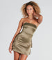 Play up the cargo trend in this satin mini dress! Crafted from silky smooth satin. this mini dress will have you feeling oh-so-luxe. It features a strapless foldover neckline with a non-slip grip lining. four side flap pockets. and a flattering bodycon silhouette. Complete the look in hoop earrings for a night on the town!