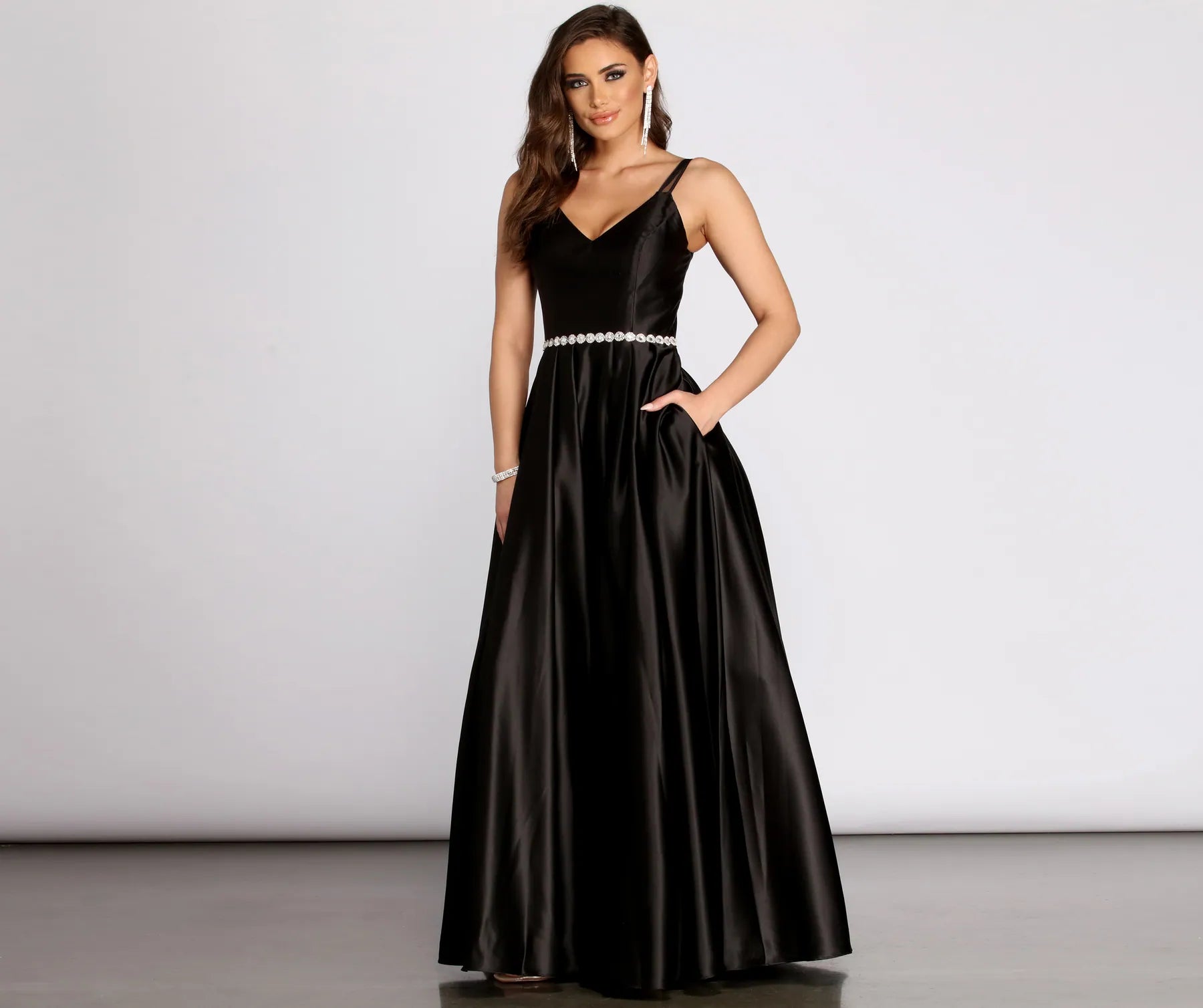 Feel like an absolute princess in our stunning Caris! Her plunging V neckline leads to a gorgeous arrangement of twinkling rhinestones along the waist. You'll be twirling around nonstop in her dramatic and voluminous ball gown. Finish the look off by adding some rhinestone earrings!