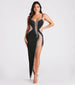 Designed to give the illusion of an hourglass figure. the Carla formal dress enhances your curve appeal while radiating glamour! Perfect for galas. award ceremonies. and dressy cocktail events. She features a sleeveless V-neckline with a nude sheer mesh insert. adjustable spaghetti straps. sheer mesh nude inserts along the sides and at the hem. a hip-hugging slim silhouette. high side cutout. a long hem. and a rhinestone embellished pattern in a curve-flaunting design. The formal dress is composed of a crepe and mesh fabric with plenty of stretch. Complete the look with fringe earrings.