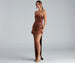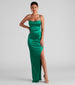 Make your appearance one remember with a formal dress that brings the drama! Carmella features a sleeveless. square neckline. built-in padded bust with a pleated overlay. adjustable spaghetti straps. and a corset bodice with flexible boning. The slim-fit bodice leads to a curve-hugging A-line silhouette accented with a high side slit. The dress is composed of a lined satin fabric that offers a form-hugging fit with minimal stretch. Complete look with a faux fur wrap and rhinestone heels.