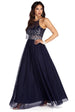 Brighten up the midnight sky as you shimmer in the radiating Carmen dress! She features a deep navy blue color. a partially lined mesh bodice. a halter neck with neck ties. a sweetheart bust lining. padded cups and a back keyhole. Her bodice is adorned with a glitter detail set in a baroque-inspired print and a sheer unlined mesh waist band. Her voluminous ball gown silhouette is adorned with glitter accents and a petticoat. Dress is composed of a combination mesh. tulle and knit fabric that offers a relaxed fit with minimal stretch.