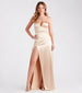 Strut with style at your next special event in the gorgeous Carmen satin formal dress. She features a sleeveless. deep V-neckline. adjustable spaghetti straps. a form-hugging silhouette. and a floor-sweeping skirt with a sultry thigh-high front slit. Complete the look with statement earrings and a sparkly evening bag.