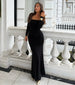 Channel an elegant moment in the Carmen long column dress that features an off-the-shoulder neckline. a draped ruched bodice. and fitted long sleeves. Complete the look with rhinestone earrings for the perfect wedding guest outfit.
