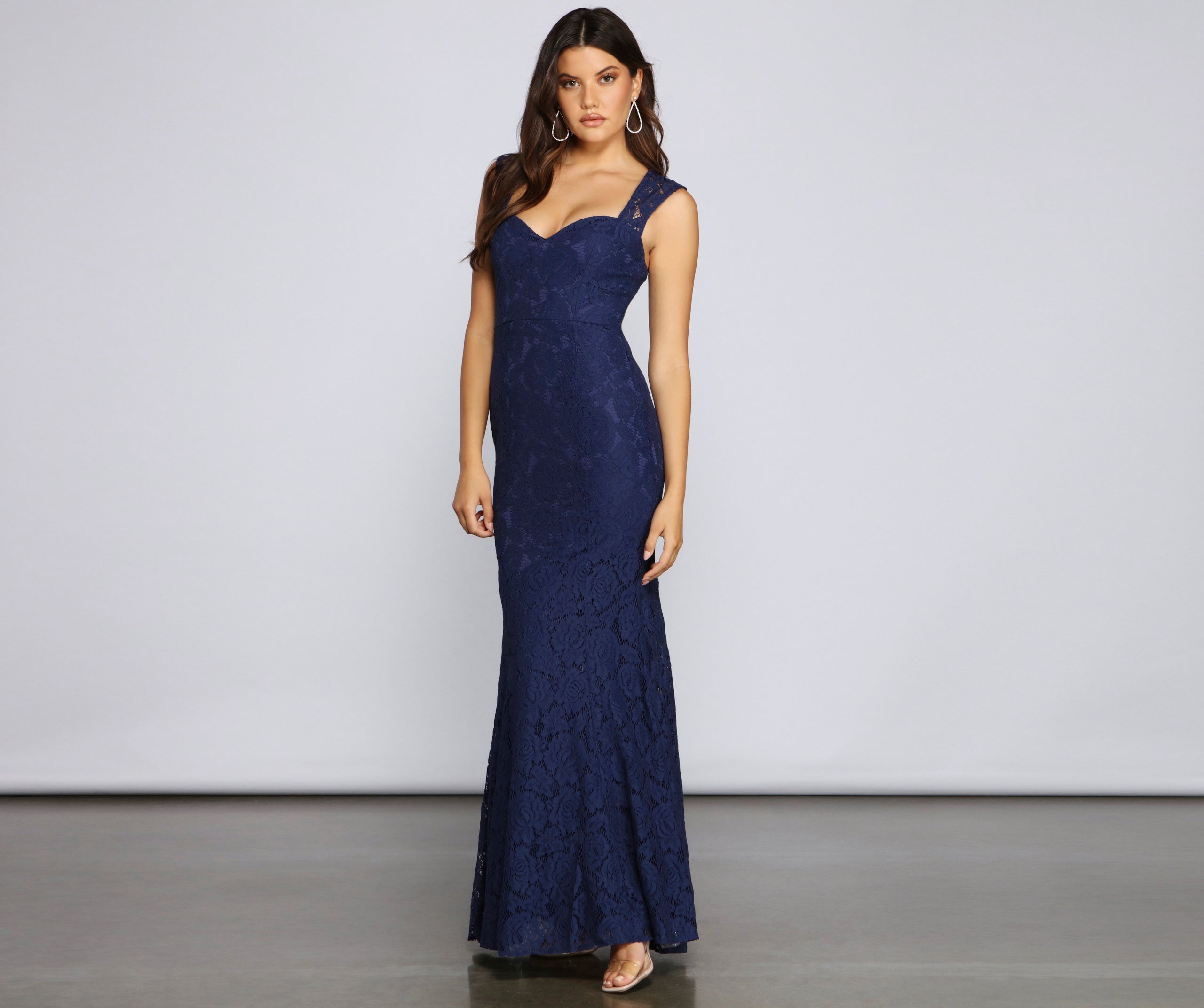 Showcase a gorgeous elegant vibe in the stunning Caroline lace mermaid dress. She features a flattering sweetheart neckline. sheer lace shoulder straps that lead to an open back design. a high waist seam. and a floor-length form-hugging mermaid silhouette. Style this dress with rhinestone earrings and a chic tennis bracelet.