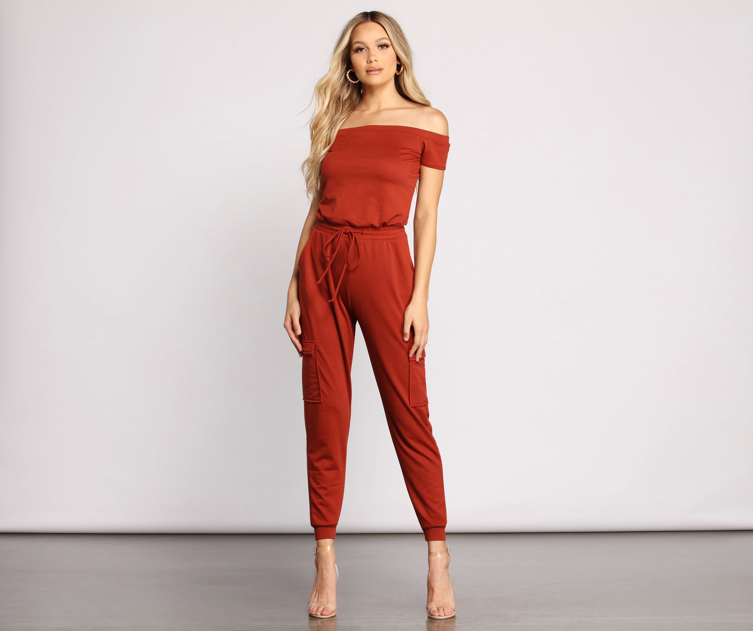 Carry On In Style Off The Shoulder Cargo Jumpsuit