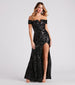 It's your time to shine in the Carter A-line long formal dress for your special night. She features an off-the-shoulder. cuff sleeve neckline with a non-slip grip and a center-notch accent. Her shimmering sequin scroll pattern catches the light showing off her form-fitting silhouette with a sexy high-cut slit. The lined mesh fabric gently kisses the floor along the flowy hem. Complete your glitzy look with this long dress with a rhinestone drop necklace.