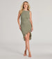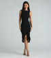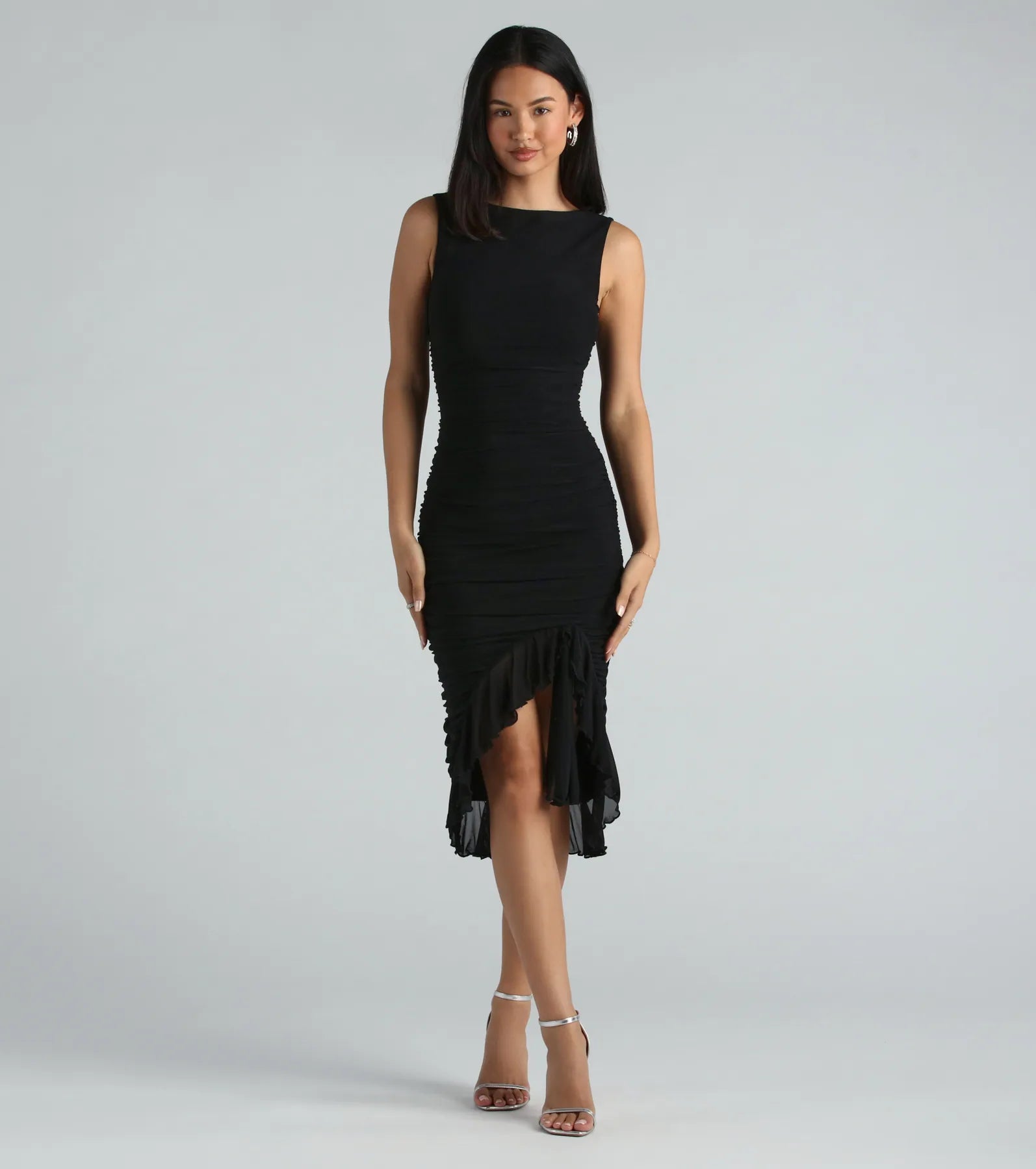 The Casey formal mesh dress will have you looking tasteful and elegant for banquets or rehearsal dinners! She features a sleeveless high neckline. a square-cut back. side. and back ruching to accentuate your gorgeous curves. a bodycon silhouette. and a playful surplice ruffled midi-length hem. The formal dress is crafted from a sheer mesh fabric with a sewn-in knit lining and plenty of stretch. Complete the look with earrings and stiletto heels.