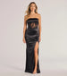 Dare to showcase a sleek and sultry allure at your black-tie affair in the Cassia satin knit mermaid dress designed with a sheer lace corset bodice with floral applique accents for a chic detail. It features a strapless straight-across neckline with a padded bust. flexible boning for structure. and a high-cut front slit along the floor-length. curve-hugging mermaid silhouette.
