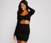 Create a perf casual-chic look with this must-have mini dress. It features a sweetheart neckline. long fitted sleeves. an adjustable drawstring at the bust. a sultry waist cutout. ruching. and a short. form-hugging silhouette. Style this dress with sneakers.