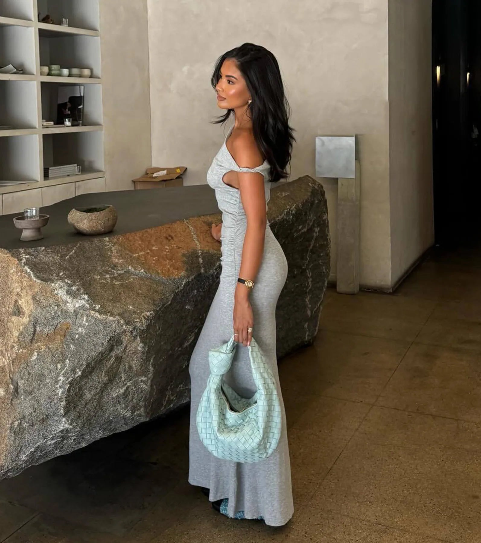 Effortlessly elevate your everyday looks with this casual chic ribbed knit maxi dress. It features a sleeveless boat neckline. tank shoulder straps with a trendy twist-back design. ruched side seams at the waist to accentuate your curves. and a fitted A-line silhouette with a maxi-length hem to flaunt your figure. Style with hoop earrings and strappy mules.