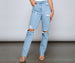 These straight-leg jeans are perf for achieving that laidback. casual everyday look. They feature a high-rise waist and distressed details on the straight-leg silhouette with a trendy raw cut hem. Style these jeans with a graphic tee.
