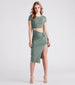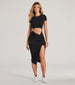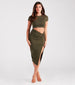Your next casual plans call for this t-shirt midi dress for grabbing coffee or running errands in style! It features a classic crew neck. short sleeves. a cutout waist with a knot accent. a bodycon silhouette. and a flirty front slit on smooth cotton knit fabric. Complete the look in cute strappy sandals.