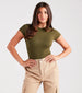 Look and feel casually cute in this basic bodysuit that makes the perfect essential! It features short sleeves. a crew neck. a form-hugging fit. and a thong bottom with dual snap-button closures. and is crafted on soft brushed knit double-lined fabric. Style with cargo pants for an on-trend look!