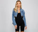 Keep it casually edgy with a denim jacket that you can layer over your edgy looks! The jacket features a collared neckline. two chest pockets. a snap button front. long sleeves. and a high-low hem with frayed trim. Complete look with a crop top and high waist jeans.