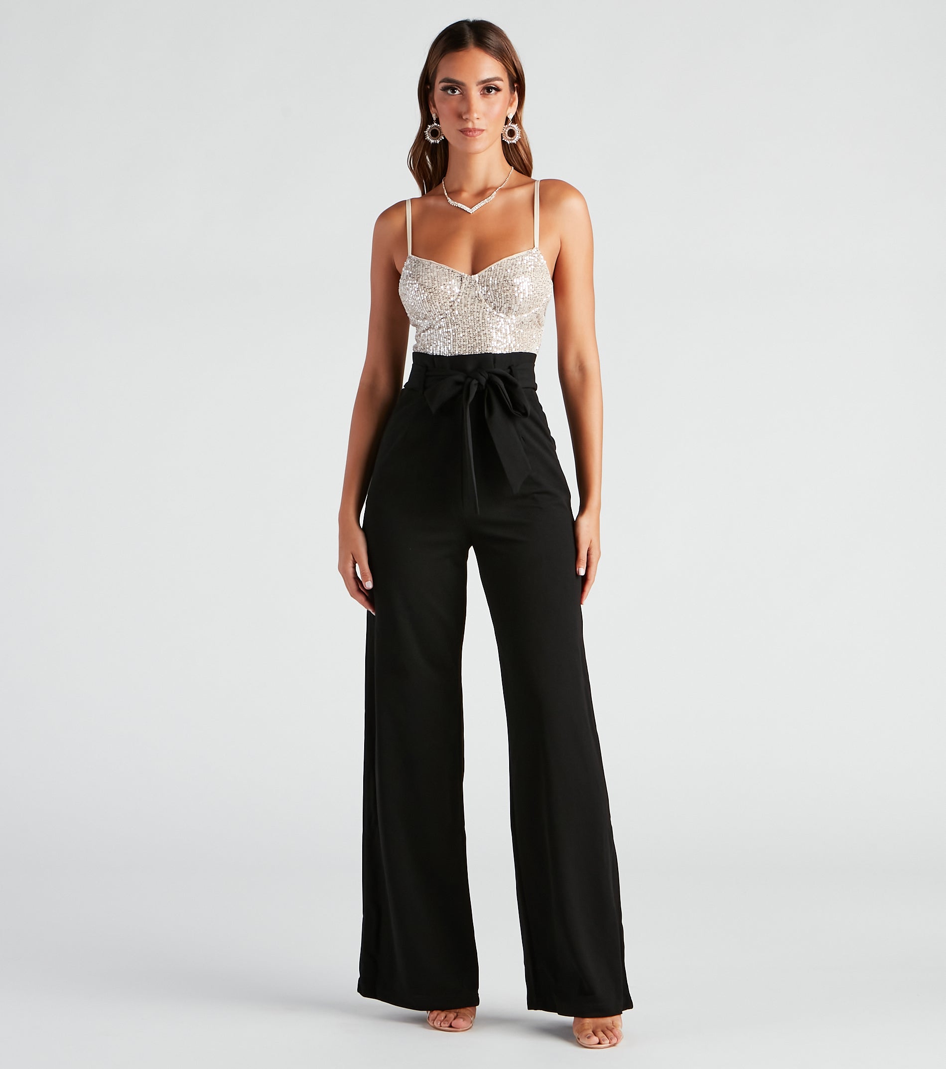 Make jaws drop strutting in wearing this sequin jumpsuit at the party! It features a sleeveless sweetheart sequin top with adjustable spaghetti straps. crepe bottoms with a paperbag high-rise waist. a tie-front belt. and a wide-leg silhouette. Complete the look with clear mules.