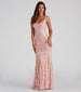 Sparkle all night in the Catherine formal dress for prom! Catch the light in her shimmering sequin scroll pattern on a chic. sleeveless. V-neck. with mesh straps atop her form-fitting bodice. Flaunt some skin in her alluring open-back design with criss-cross straps sure to turn heads. She features a figure-flattering mermaid silhouette that leads to a flared floor-length hem. The formal dress is composed of a mesh overlay with an inner lining and no stretch. Complete your prom look with a glam necklace set.