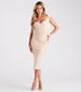 Major curve appeal! The Catherine formal bandage dress perfects your silhouette and flatters to give you a flawless look at cocktail parties and dressy occasions! She features a classic sleeveless sweetheart neckline with an eyelash lace trim. tie shoulder straps. a padded bust and corset-style bodice. and a midi-length bodycon silhouette with a center back slit. The formal dress is composed of a tight-knit bandage knit fabric that helps to give the illusion of an hourglass figure! Complete the look in chic lace-up heels and jewelry.