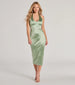 This sleeveless bodycon midi dress features a sultry halter V-neckline and a scoop back. The stretchy satin material wraps your body perfectly. highlighting the sleek design perfect for semi-formal weddings or cocktail soirees.Â