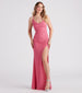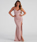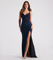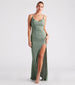 Turn heads and make a sparkly statement in the stunning Celina dress! She features a sleeveless cowl neckline. spaghetti straps that lead to a cross-back design. front ruched detailing. and a floor-length mermaid silhouette with a thigh-high slit. Complete the look with rhinestone statement earrings and chic heels.