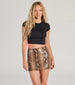 Charm everyone in this faux leather snake mini skirt featuring a flattering high-rise waist and bodycon silhouette. Perfect for styling with boots for any occasion.