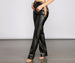 Keep it chic with high waist pants that bring that edgy glam! The pants feature a high-rise waist. a single button with zipper closure. dual chain-link closures at the hip. and a straight leg fit. The pants are composed of a faux leather fabric that offers a form-hugging fit with a moderate stretch. Complete the look with a crop top and mules.